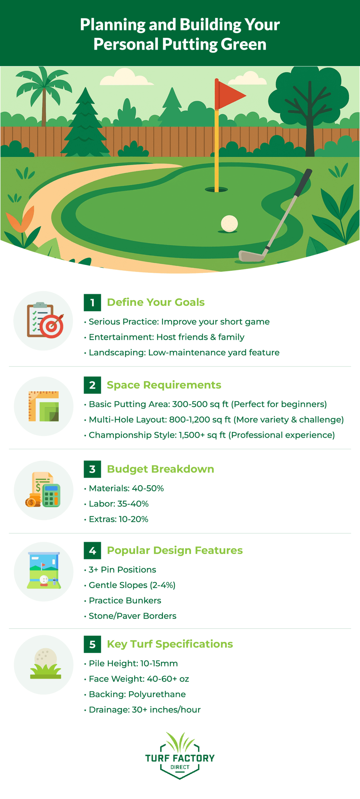 Premium turf systems with multi-layer builds or shock pads cost more but deliver performance and durability for serious players. For more insights on material selection and installation, see our comprehensive article on golf greens at home.
