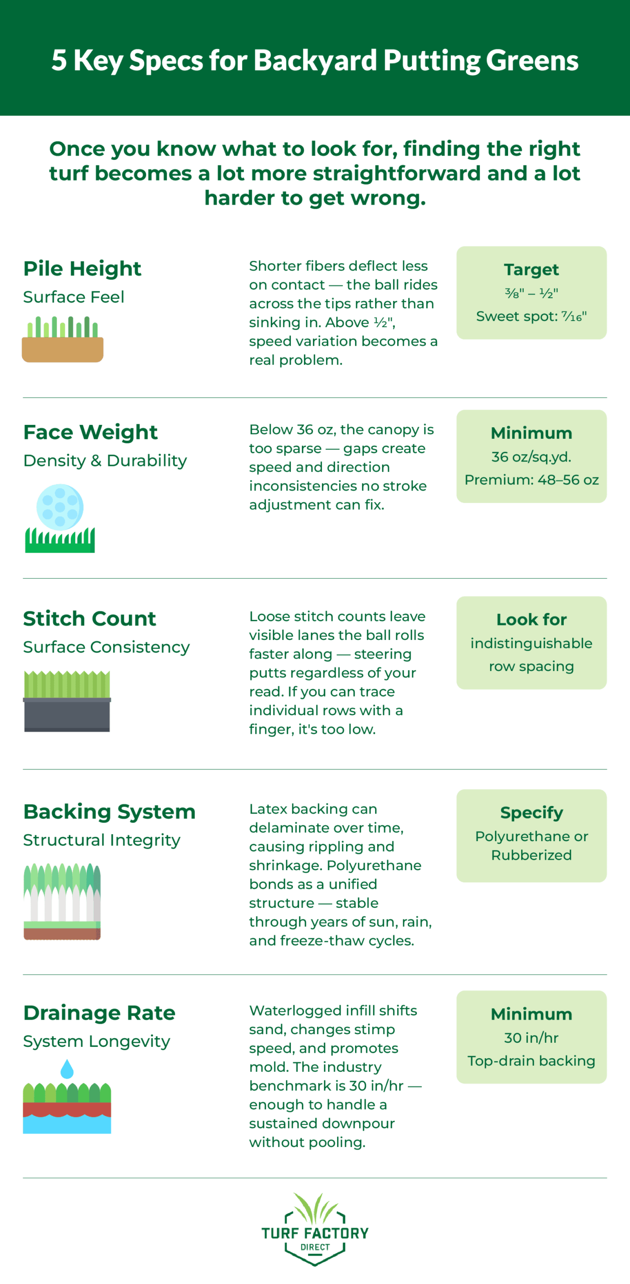 Reading a turf spec sheet is like reading a club fitting chart — once you know what the numbers mean, the right choice becomes obvious. These five specs determine whether a green plays like a professional practice facility or an expensive disappointment.