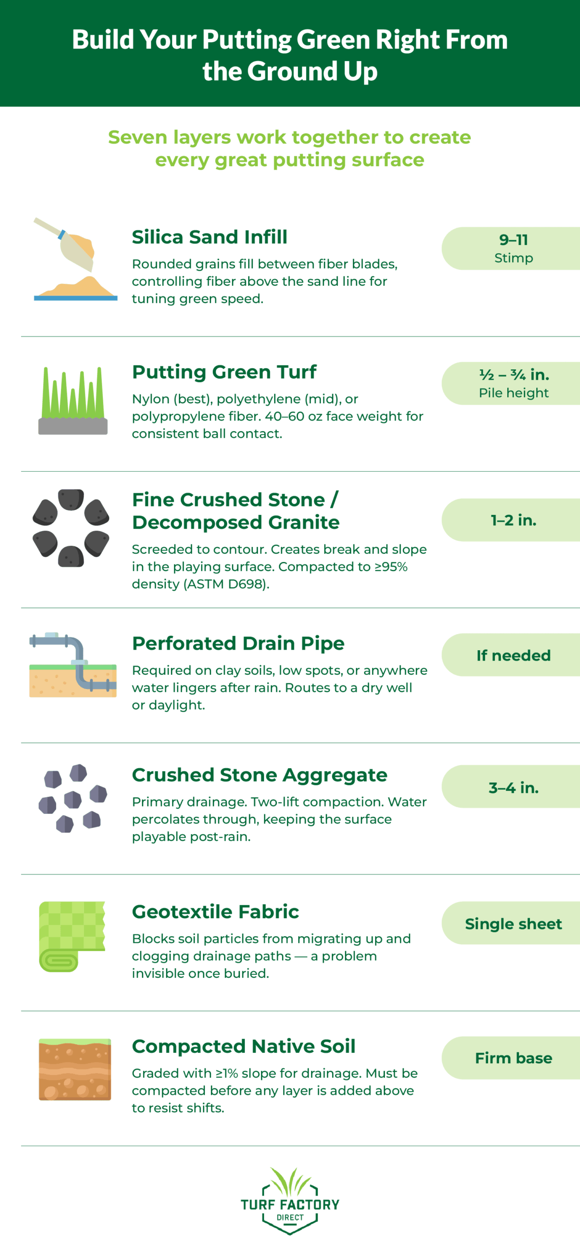 - Three non-negotiable elements determine whether a backyard turf putting green plays like the real thing: a sub-base engineered for stability and drainage, turf fiber selected for realistic ball roll and durability, and silica sand infill calibrated to deliver consistent green speed in the 9–11 Stimpmeter range.