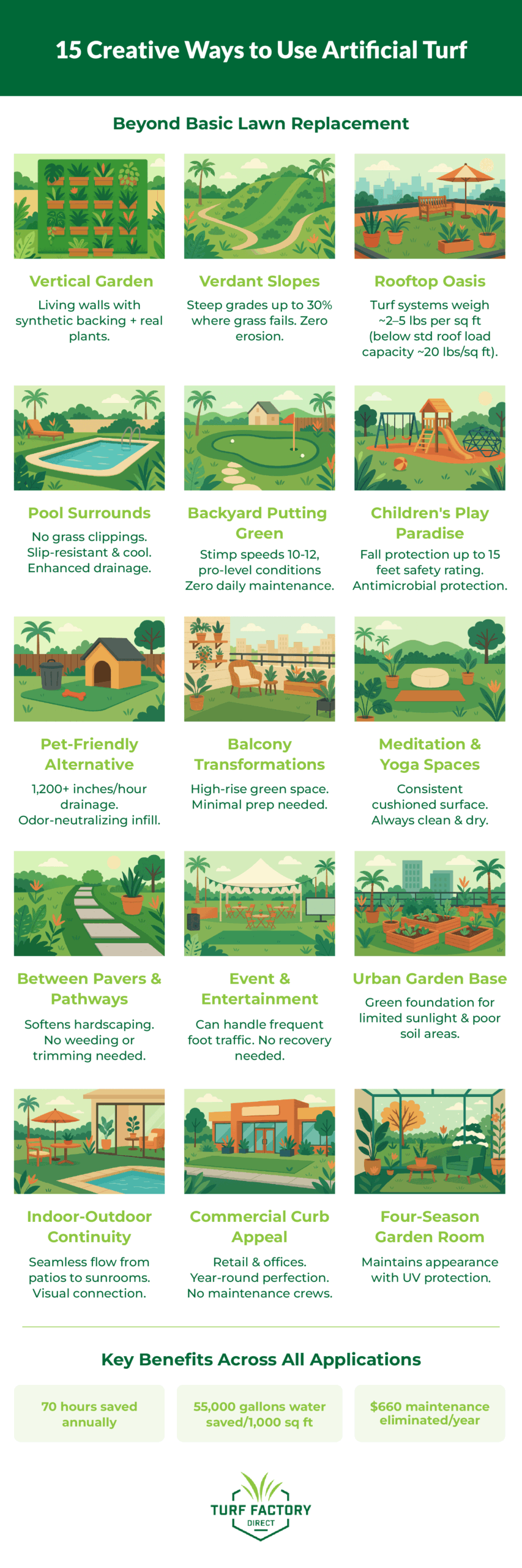 - Synthetic turf serves as a versatile design medium beyond traditional lawn replacement, enabling creative applications from vertical gardens to rooftop oases.